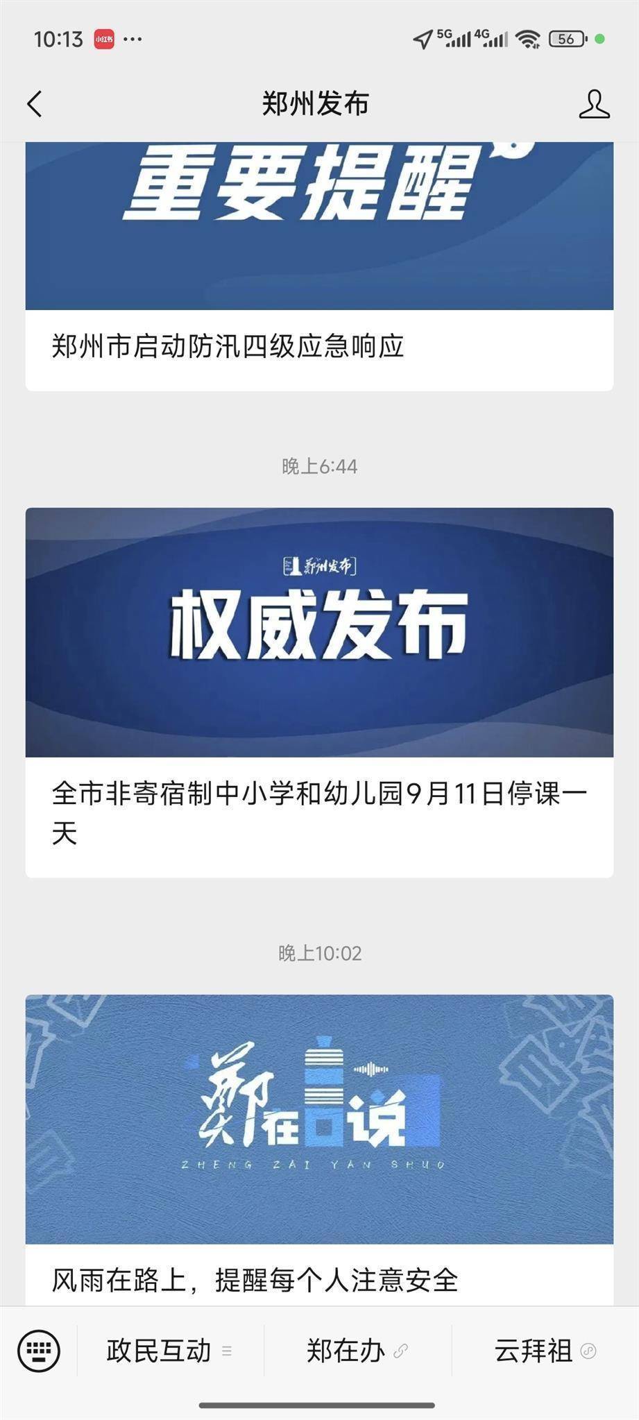 据“郑州发布”微信公众号消息,9月10日,郑州市防汛抗旱指挥部决定于9月10日16时30分启动防汛四级应急响应。建议市民群众非必要不外出,确需外出遇强降雨及时避雨。全市所有非寄宿制中小学和幼儿园9月11日停课一天,暴雨期间有室外作业的工地、深基坑工地、隧道顶管施工停工。另据央视新闻消息,记者从河南省防汛抗旱指挥部获悉,经会商研判,河南省决定于9月10日19时启动防汛四级应急响应。